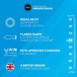 De condooms zijn vervaardigd van hoogwaardig natuurlijk latex en zijn dun genoeg om het contact zo natuurlijk mogelijk te laten aanvoelen. De licht uitlopende kop zorgt voor extra comfort tijdens het dragen en dankzij de teat tip zijn ze makkelijk en snel om te doen. Het siliconen glijmiddel zorgt voor een soepel verloop, zonder plakkerig gevoel.
